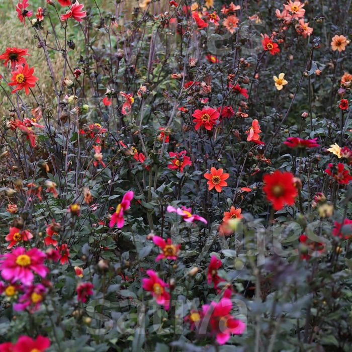 Variation du jaune à l'orange, au rouge, rose et fuchsia. Beau feuillage rouge foncé qui souligne les couleurs des fleurs. Floraison tardive, jusqu'aux premières gelées. Déterrer les tubercules pour l'hivernage car les dahlias ne supportent pas le gel.