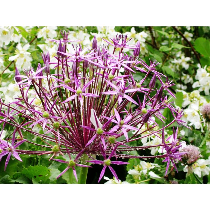 L’oignon d’ornement Allium Albopilosum « Christophii », également appelé ail étoile de Perse, possède de magnifiques fleurs roses/mauves et argentées en forme de bulbe, qui se dressent fièrement sur leurs tiges droites. Même après la floraison, cet allium garde sa valeur décorative. Grâce à leur forme de fleur intéressante, ce sont des plantes qui attirent tous les regards dans le jardin. Elles ne requièrent que peu d’entretien et se combinent joliment avec différentes plantes. Les alliums sont également de bonnes fleurs à couper et attirent les abeilles et les papillons.