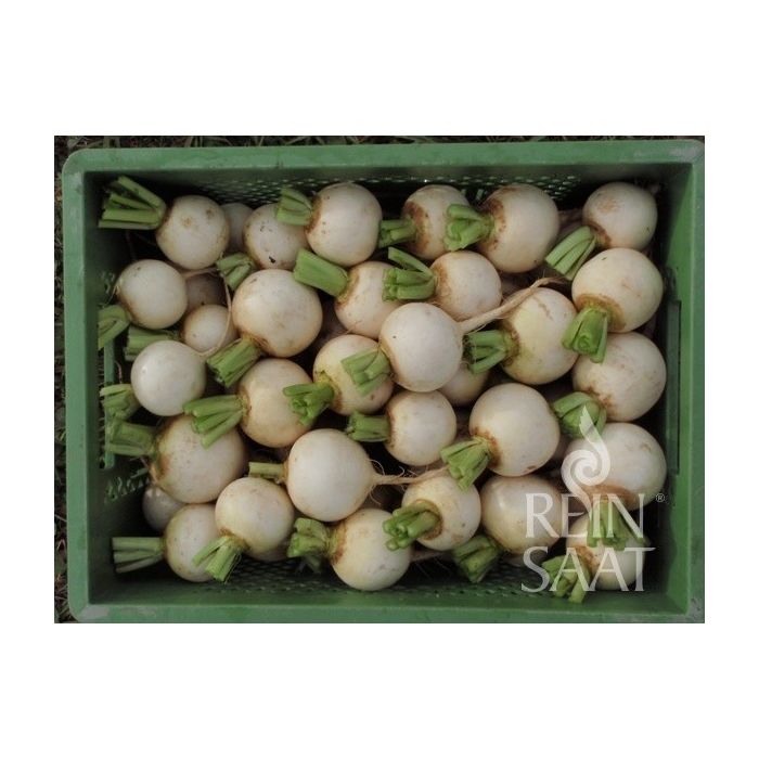 Navet très productif, à croissance rapide. Les navets ronds et blancs atteignent leur qualité optimale lorsque le diamètre de la tête est d'environ 6 à 8 cm. Chair tendre et ferme à la saveur acidulée et légèrement sucrée. Excellent navet pour les crudités.