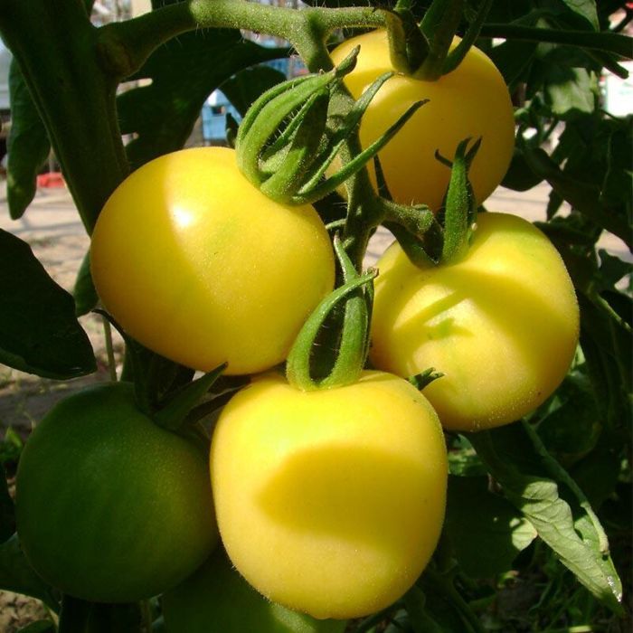 La tomate 'Mirabelle Blanche' a des grappes de 6 à 9 tomates. Les fruits sont blancs, ivoire transparent et rose marbré. Les tomates ont un poids de 60-80 grammes et un diamètre de 5-7 centimètres. Soutenez la tige principale et enlevez régulièrement les pousses (épines) dans les aisselles.