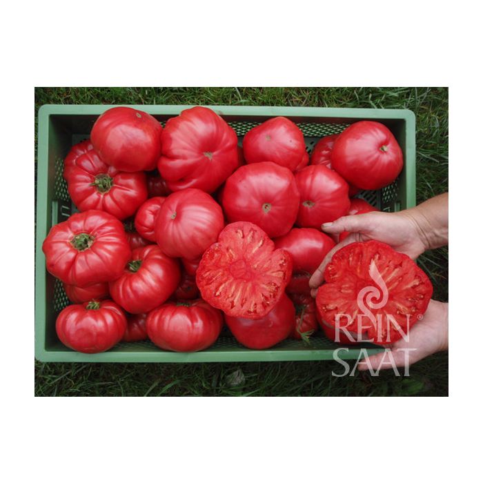Très grosse tomate à chair ronde à plate, d'une excellente saveur et à la chair ferme et juteuse. Les fruits volumineux sont exceptionnellement résistants à la fissuration malgré leur peau fine. Convient parfaitement aux jardins d'agrément et à la vente en circuit court. Poids du fruit jusqu'à 900 g.