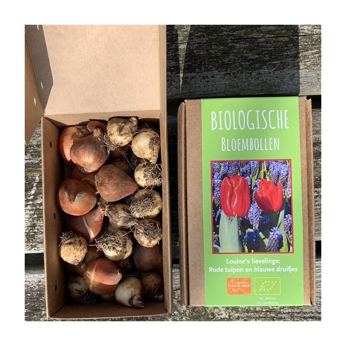 Ce mélange amusant de 30 bulbes biologiques est un festin de couleurs pour votre jardin ! 20 scillas bleues, 10 grandes tulipes rouges. Cette belle combinaison de tulipes rouges et de raisins bleus a été sélectionnée par Louise. Cette joyeuse dame apporte un confort supplémentaire lors de l'emballage. Elle est toujours prête à plaisanter et à rendre tout le monde heureux. Comme Louis, profitez des tulipes rouges et des raisins bleus qui attirent les abeilles au printemps prochain.