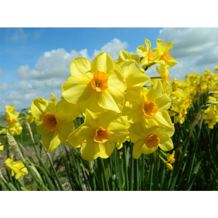 La narcisse Martinette fleurit en avril avec des grappes de fleurs jaunes étoilées et une trompette orange vif. Vivace, rustique et parfumée, elle apprécie le soleil ou la mi-ombre et un sol bien drainé. Parfaite pour massifs, pots et bouquets printaniers.