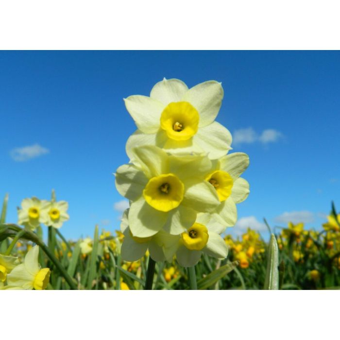 Narcisse de Tazetta, petites fleurs gaies, d'un jaune tendre. Convient à la culture en pot et est agréablement parfumée.