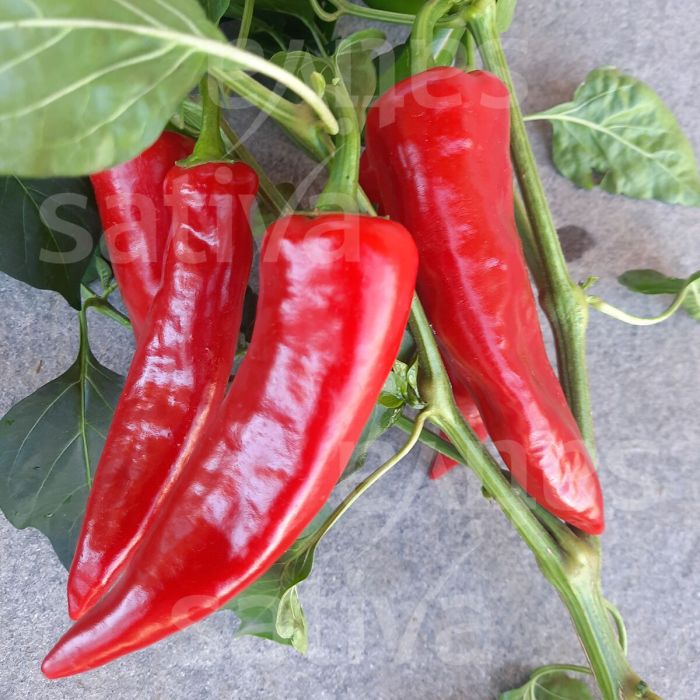 Piment au piquant agréable et à la saveur aromatique. Buissons vigoureux à fruits rouges de 10 à 14 cm de long. Convient bien au séchage. Un délice également grillé ou farci.