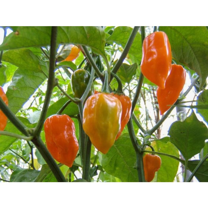 Piment Habanero très piquant et fruité. Fruits en forme de lanterne passant de la couleur vert jaune à orange à maturité. Convient à l’élaboration de sauces piquantes. Utiliser de préférence frais car il perd un peu de son arôme en séchant. Phase de croissance : env. 100 jours. La culture préparatoire en pépinière chaude ou froide est très importante. Degré de piquant 9-10, très piquant !