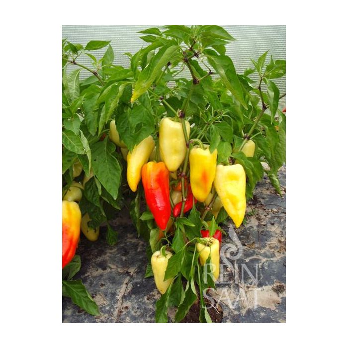 Variété très précoce cultivée en plein champ par ReinSaat, avec de gros fruits pointus qui mûrissent du jaune clair au rouge orangé. Ces poivrons à chair ferme, pesant environ 120 g, intensément sucrés et aromatiques, conviennent aussi bien à la consommation fraîche qu'à la transformation. Semis direct possible (dans les régions très chaudes à partir d'avril).