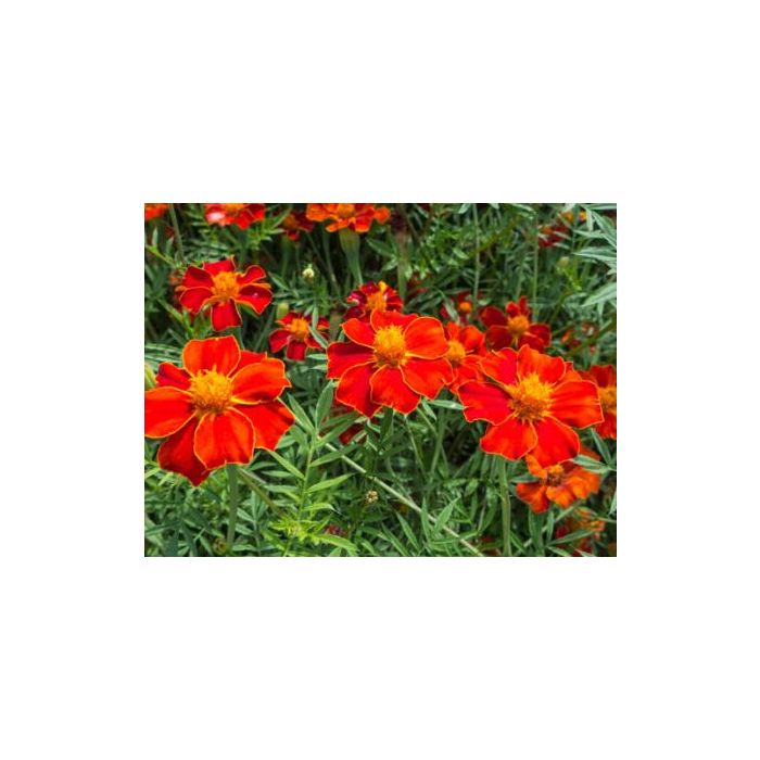 Attrayant tagète à feuilles vigoureuses et de grande taille. Ce tagète érigé a de belles fleurs rouges à bord jaune et c'est un merveilleux florifère qui fleurit jusqu'à l'automne. jusqu'à l'automne. Il prospère dans n'importe quelle bonne terre de jardin et nécessite peu d'entretien.