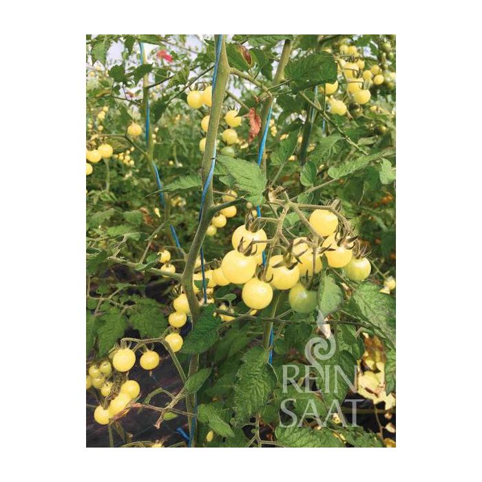 Weisse Ribisel est la tomate cocktail idéale pour l'extérieur ! Ses masses de fruits blanc crème de 1 à 2 cm mûrissent tôt et ravissent par leur incroyable douceur et leur saveur pleine. Elle est issue d'un croisement de tomates sauvages, ce qui garantit une croissance forte et extrêmement saine jusqu'à l'automne et rend l'éclaircissage inutile.