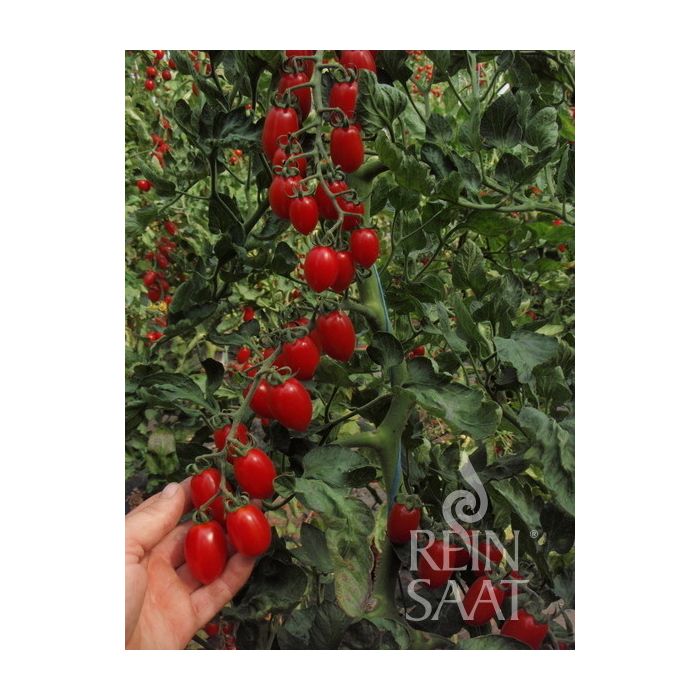 Indeterminant wachsende Datteltomate mit tiefroten, platzfesten, festfleischigen Früchten. Die Früchte haben ein ausgezeichnetes, kräftiges süßfrisches Tomatenaroma und zeichnen sich durch lange Haltbarkeit aus.