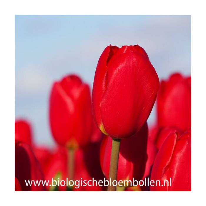 Cette tulipe rouge feu se distingue dans n'importe quel jardin. Appartenant à la famille des tulipes Triumph, elle a également une forme de fleur magnifiquement grande et une tige haute et robuste. Pendant sa croissance, elle est à moitié cachée entre de larges feuilles bleu-vert. Lentement, elle grandira au-delà de son lit de sécurité et élèvera fièrement son beau calice dans les airs. Comme il sied à une bonne tulipe Triumph, elle peut résister au vent et aux intempéries.